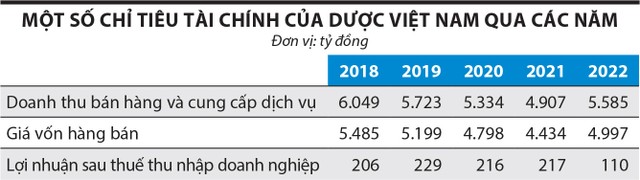 Tại đại hội cổ đông thường niên 2023, lãnh đạo Dược Việt Nam cho biết, trong khi năm 2022, toàn ngành ghi nhận mức tăng trưởng khoảng 11% so với năm 2021, thì báo cáo tài chính tổng hợp của Tổng công ty cho thấy tổng doanh thu giảm 36%, lợi nhuận sau thuế giảm 88,7%. Lý do chính là doanh thu hoạt động tài chính giảm, do một số công ty thành viên thực hiện chi trả cổ tức bằng cổ phiếu. Năm 2022, do diễn biến tiêu cực của thị trường chứng khoán, giá cổ phiếu của một số đơn vị thành viên giảm sâu, Dược Việt Nam phải trích lập dự phòng giảm giá đầu tư tài chính là 91,7 tỷ đồng.