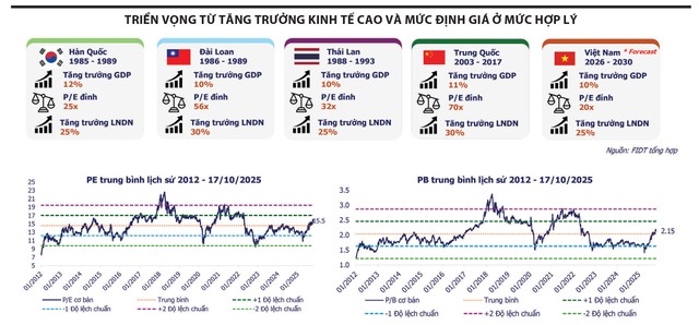 Thứ ba, cũng là quan trọng nhất, đó là nền tảng định giá hấp dẫn. Lợi nhuận sau thuế của các doanh nghiệp niêm yết trong 9 tháng đầu năm ước tính tăng trưởng 17% so với cùng kỳ năm ngoái. Với tốc độ này, hệ số P/E dự phóng (forward P/E) của VN-Index cho cả năm 2025 chỉ rơi vào khoảng 12,5 lần. Đây là một mức định giá rất hấp dẫn, thấp hơn đáng kể so với mức trung bình lịch sử (khoảng 15 - 16 lần) và cạnh tranh hơn hẳn so với hầu hết các thị trường khác trong khu vực ASEAN. Điều này có nghĩa là, thị trường đang rẻ hơn so với tiềm năng tăng trưởng của chính nó, tạo ra một biên an toàn và dư địa tăng giá lớn cho các nhà đầu tư dài hạn.