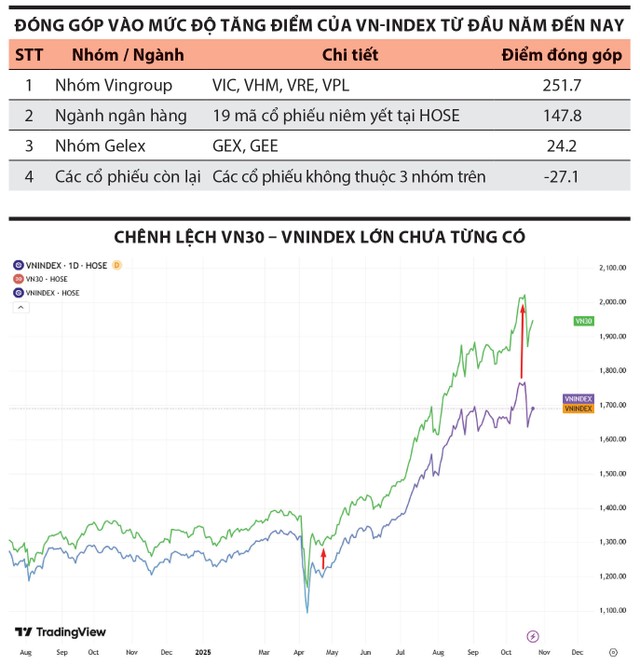 Nếu chỉ nhìn vào con số tăng trưởng hơn 30% của chỉ số VN-Index từ đầu năm đến nay, người ta có thể lầm tưởng về một năm đầu tư thành công. Nhưng thực tế lại là một câu chuyện hoàn toàn khác, một câu chuyện về sự phân hóa sâu sắc đến mức tạo ra hai thế giới song song ngay trên cùng một bảng điện. Thống kê cho thấy, nếu loại trừ đi các nhóm cổ phiếu đóng góp lớn và nhóm ngân hàng, phần còn lại của VN-Index thậm chí còn giảm điểm. Điều này khiến nhiều nhà đầu tư thua lỗ dù chỉ số tăng, đặc biệt trong những tháng gần đây.