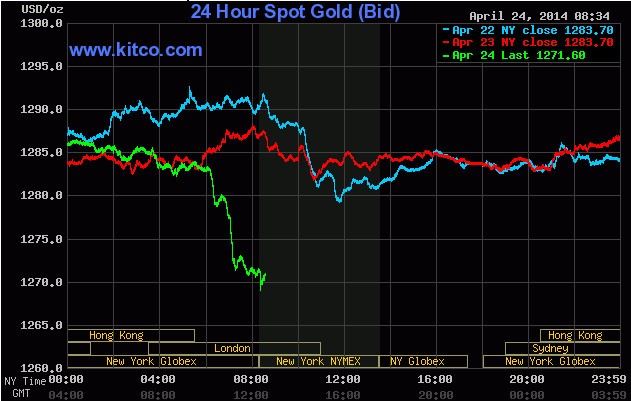 Giá vàng giao tháng 6 đã giảm 1% xuống còn 1.271,5 USD/ounce vào lức 7h44 trên sàn Comex Mỹ. Giá đã đạt mức 1.269,2 USD, mức thấp nhất kể từ 10/2.