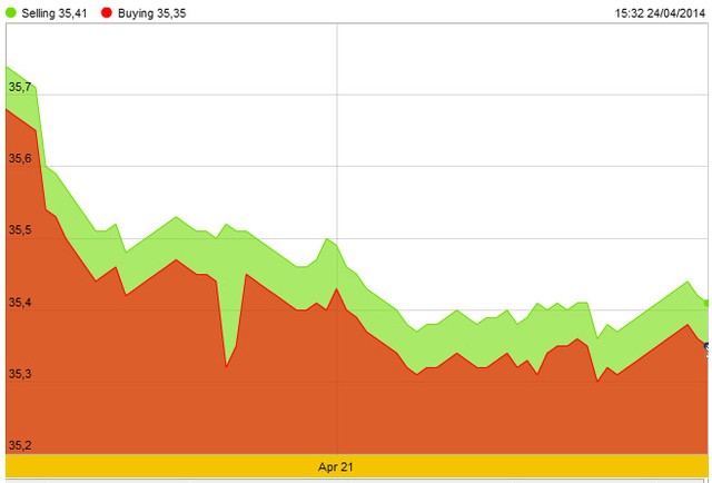 Tại thị trường trong nước, giá vàng SJC rục rịch tăng lại trong ngày hôm nay và cho đến hết giờ giao dịch buổi chiều, giá chưa kịp phản ánh đợt giảm sau đó của giá vàng thế giới. Khép lại ngày, giá vàng thương hiệu quốc gia là 35,35 - 35,41 triệu đồng/lượng, tăng 30.000 đồng/lượng so với chiều qua. Trong ngày, giá có lúc lên mức cao nhất là 35,38 - 35,44 triệu đồng/lượng.
