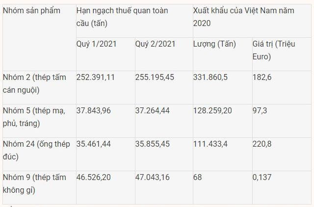 Hiện nay, trong số các sản phẩm thép của Việt Nam xuất khẩu sang EU, có 4 nhóm sản phẩm đang bị áp dụng biện pháp tự vệ dưới hình thức hạn ngạch thuế quan bao gồm: nhóm 2 (thép tấm cán nguội), nhóm 5 (thép mạ, phủ, tráng), nhóm 9 (thép tấm không gỉ), nhóm 24 (ống thép đúc). Cụ thể: