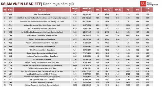 Hiệu suất của quỹ trong 3 năm qua đạt 115%, cao gấp đôi mức tăng 57% của VN-Index. Tính từ đầu năm 2025 đến ngày 4/12, lợi nhuận của VNFINLEAD tăng khoảng 40%. Danh mục hiện chỉ giữ dưới 1% tiền mặt, phần còn lại tập trung ở các cổ phiếu ngân hàng đầu ngành như VPB (15,7%), TCB (14,28%), MBB (9,74%), HDB (7,06%)…
