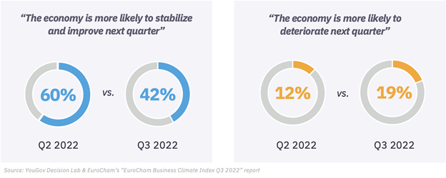Mặc dù vậy, khi lãnh đạo các doanh nghiệp được hỏi về triển vọng kinh doanh của doanh nghiệp mình trong quý IV/2022, 45% trả lời tích cực, chỉ giảm 4 điểm so với quý trước. Đồng thời, kỳ vọng kế hoạch đầu tư, đơn đặt hàng và doanh thu vẫn tương đối ổn định so với quý trước, điều này cho thấy triển vọng lạc quan hơn so với nền kinh tế nói chung.