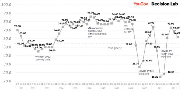 Mặc dù trong quý III/2022, nền kinh tế Việt Nam tăng trưởng kỷ lục ở mức 13,67% so với cùng kỳ năm trước, nhưng BCI đã giảm quý thứ hai liên tiếp, với mức giảm 6,4 điểm phần trăm giảm so với quý 2 và 10,8 điểm so với quý 1. Điều này xảy ra vào thời điểm các điều kiện kinh tế toàn cầu vẫn không ổn định do xung đột leo thang ở Ukraine, áp lực lạm phát dai dẳng, tình trạng thiếu lao động trên toàn thế giới và tăng trưởng toàn cầu trì trệ.