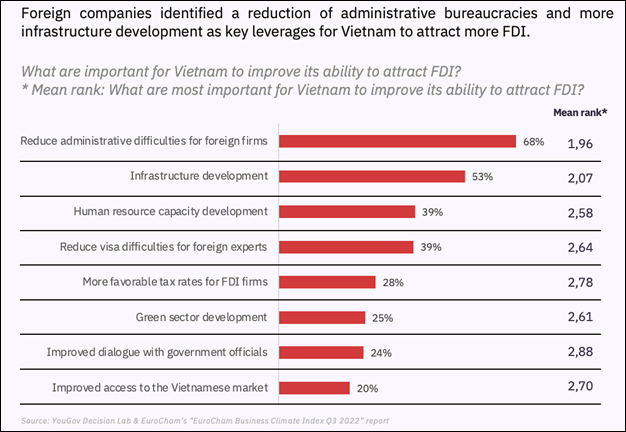 Đối với đầu tư trực tiếp nước ngoài, 42% dự đoán công ty của họ sẽ tăng dòng vốn FDI vào Việt Nam vào cuối năm 2022. Họ cũng chỉ ra rằng, Việt Nam có thể tăng mức vốn FDI này bằng cách giảm bớt khó khăn về hành chính (68%), cải thiện cơ sở hạ tầng (53%), phát triển năng lực nguồn nhân lực (39%), và giảm rào cản thị thực cho các chuyên gia nước ngoài (39%).