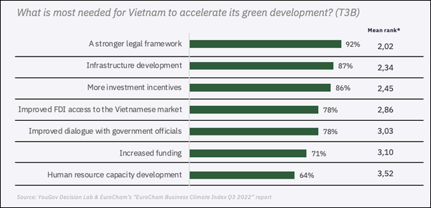 Mặc dù 1/4 số người được hỏi xác định tăng trưởng xanh là yếu tố then chốt trong việc thu hút FDI vào Việt Nam, nhưng số lượng người được hỏi đánh giá tích cực về tiềm năng xanh của Việt Nam đã giảm từ 44% xuống 32%. Để thúc đẩy phát triển xanh, những người tham gia BCI khuyến nghị Việt Nam cần cải thiện khung pháp lý (92%), cơ sở hạ tầng (87%) và các ưu đãi về đầu tư (86%).