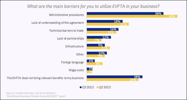Tháng 8/2022 đánh dấu hai năm thực hiện Hiệp định Thương mại tự do Việt Nam - EU (EVFTA), nhận thức về lợi ích của Hiệp định đã giảm 4 điểm phần trăm so với quý trước. Thủ tục hành chính được coi là rào cản chính (38%), tiếp đến là sự thiếu hiểu biết về hiệp định (18%) và các rào cản kỹ thuật đối với thương mại (16%).