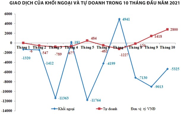 Trái với sự hưng phấn của nhà đầu tư nội, khối ngoại đã rút ròng 46.404 tỷ đồng trên HOSE, còn khối tự doanh công ty chứng khoán mua ròng không nhiều (854 tỷ đồng). Như vậy, trong 10 tháng đầu năm nay, dòng tiền nâng đỡ thị trường là các nhà đầu tư cá nhân trong nước, thay vì khối ngoại như giai đoạn 2012 - 2018.