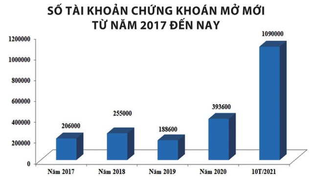 Số lượng tài khoản chứng khoán mở mới hàng tháng duy trì ở mức cao, lũy kế 10 tháng đầu năm 2021 đạt gần 1,1 triệu, tăng 176% so với cả năm 2020, nâng tổng số tài khoản lên hơn 3,86 triệu, trong đó gần 99% của nhà đầu tư trong nước.