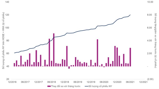 Trong khi đó, sàn HNX có tổng số cổ phiếu đang niêm yết lên 14,83 tỷ cổ phiếu, tăng 165 triệu cổ phiếu so với tháng 5.