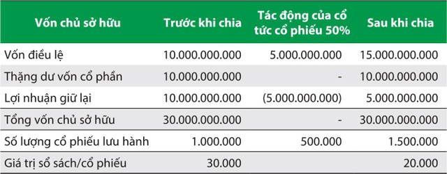 Ví dụ minh họa đơn giản trường hợp chia cổ tức bằng cổ phiếu với tỷ lệ 50% bằng nguồn lợi nhuận giữ lại, nhà đầu tư sở hữu 100 cổ phiếu được nhận mới 50 cổ phiếu. Tuy nhiên, tổng vốn chủ sở hữu không thay đổi và giá trị sổ sách giảm đi tương ứng.