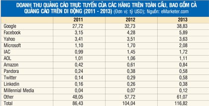 Cần phải nói thêm là, doanh thu quảng cáo trên di động của Facebook trên toàn cầu có sự tăng trưởng mạnh mẽ. Theo Công ty Nghiên cứu thị trường eMarketer (Mỹ), Google đang thống trị quảng cáo trên di động toàn cầu, nhưng doanh thu trong hai năm qua của họ hiện chỉ tăng trưởng 3%, trong khi Facebook tăng gấp đôi. Facebook hiện chiếm khoảng 12% doanh thu quảng cáo trên toàn cầu. Trong đó, 53% doanh thu trong năm 2013 của Facebook đến từ hoạt động quảng cáo trên di động.