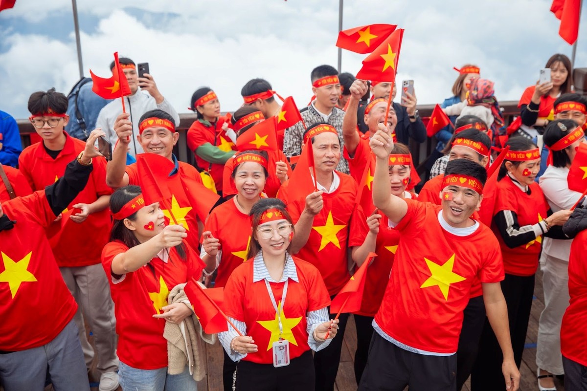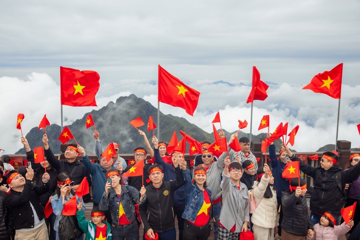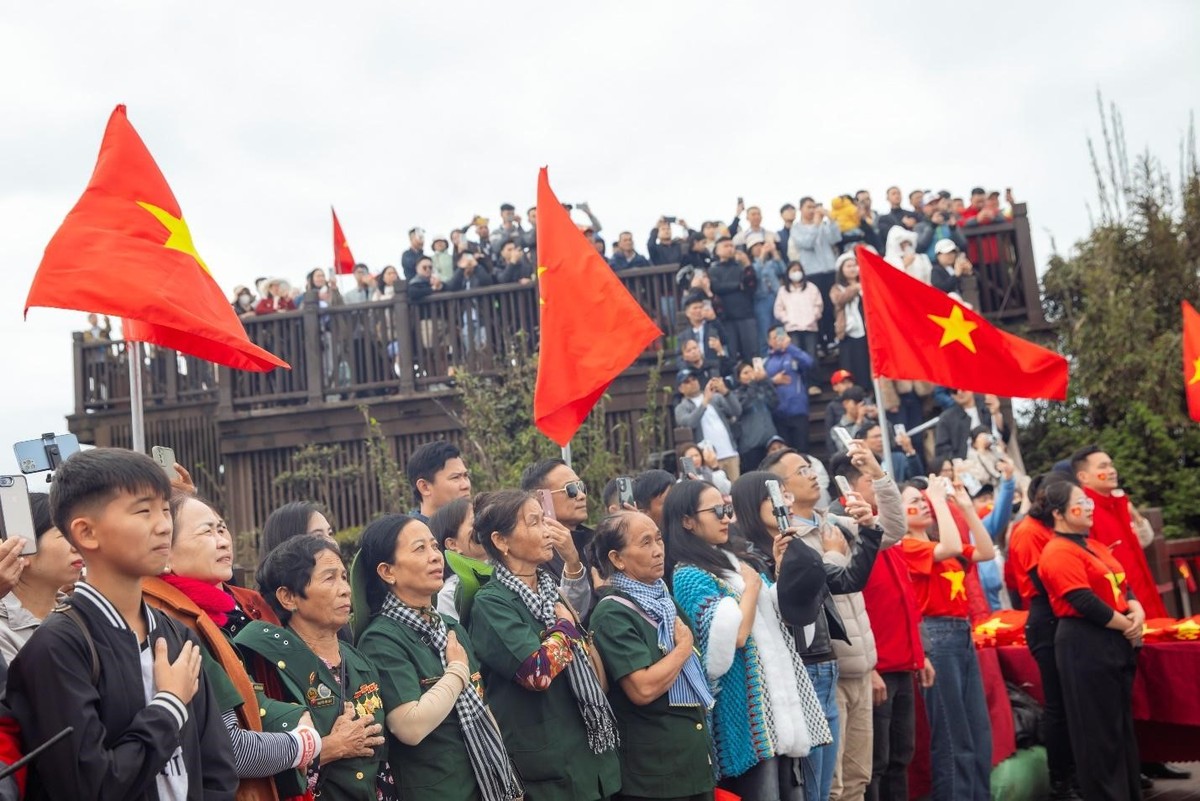 Từ sáng, 500 áo cờ đỏ sao vàng và cờ vẫy đã được khu du lịch Sun World Fansipan Legend trao tặng cho những du khách đầu tiên chinh phục nóc nhà Đông Dương. Mặc áo đỏ, tay trái cầm cờ, tay phải đặt lên ngực trái, hàng trăm người đồng loạt chào cờ và hát Quốc ca giữa trời mây trắng, tạo nên một cảnh tượng vô cùng xúc động. Sau nghi lễ, dòng người nối đuôi nhau, cùng hát vang những bài ca Khát vọng tuổi trẻ, Viết tiếp câu chuyện hoà bình, Như có Bác Hồ trong ngày vui đại thắng.