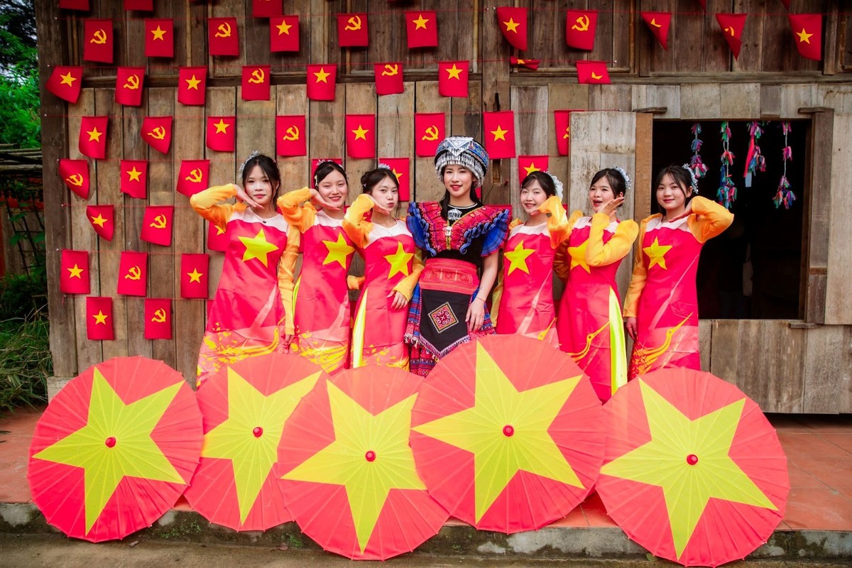 Dưới chân núi Fansipan, bản Mây, nơi du khách có thể trải nghiệm cuộc sống giản dị của người dân vùng cao, cũng khoác lên mình sắc đỏ rực rỡ. Những ngôi nhà nhỏ trong bản được trang trí bằng hàng nghìn lá cờ.