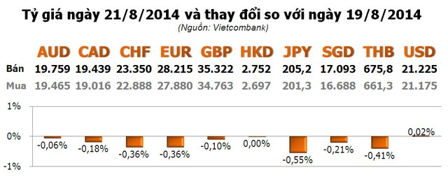 Các ngoại tệ khác đồng loạt giảm. Trong đó, giảm mạnh nhất là JPY với -0,55%; tiếp đến là EUR và CHF cùng -0,36%; THB với -0,41...