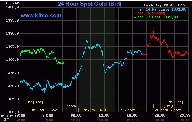 Vàng đã giữ ở gần mức cao nhất trong vòng hơn 6 tháng, sau khi hoàn thành chuỗi tuần tăng dài nhất kể từ tháng 8/2011, khi cuộc trưng cầu dân ý ở Crimea về việc rời Ukraine để gia nhập Nga thúc đẩy nhu cầu lưu giữ giá trị.