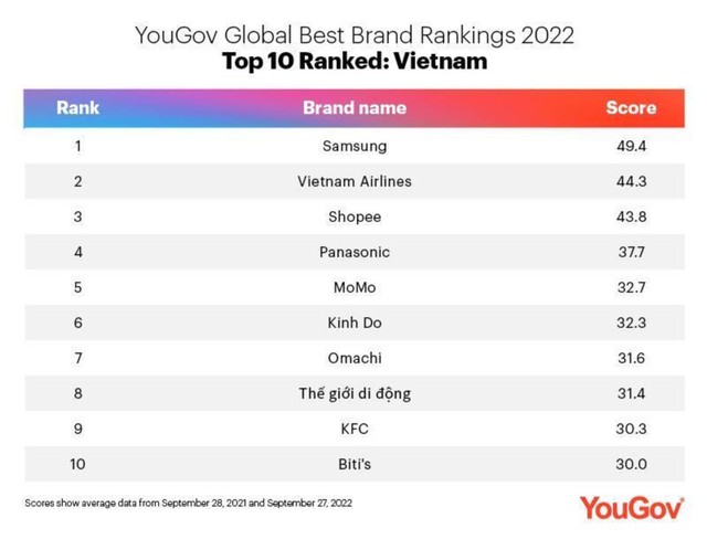 Tại Việt Nam, Bảng xếp hạng top 10 Thương hiệu hàng đầu bao phủ đa dạng các lĩnh vực và ngành hàng như điện tử, hàng không, thương mại điện tử, thực phẩm, bán lẻ..., trong đó MoMo tiếp tục là đại diện Fintech duy nhất xuất hiện trong top 10 này. Đáng chú ý, 7/10 thương hiệu dẫn đầu Bảng xếp hạng là thương hiệu Việt Nam, trong đó cùng với Vietnam Airlines, Biti’s... MoMo là thương hiệu hoàn toàn của Việt Nam, do kỹ sư Việt thiết kế, phát triển và phục vụ cho chính người Việt.