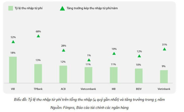 Cơ cấu thu nhập từ hoạt động dịch vụ cũng có sự dịch chuyển mạnh mẽ. Thu nhập từ phí tăng trưởng nhanh chóng trong 5 năm qua giúp đóng góp tỷ trọng lớn hơn vào tổng thu nhập của ngân hàng. Trong Top 7 ngân hàng, VIB hiện đang là ngân hàng đứng đầu về tỷ lệ thu nhập từ hoạt động dịch vụ, trong 4 quý gần nhất tỷ trọng thu nhập từ dịch vụ chiếm tới khoảng 18% tổng doanh thu hoạt động của ngân hàng. Trong khi các ngân hàng còn lại có tỷ lệ đóng góp từ thu dịch vụ dao động trung bình ở khoảng 11-12%.