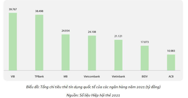 Dẫn đầu xu thế thẻ trên thị trường nhiều năm, VIB gắn liền với các sản phẩm thẻ ấn tượng và lần đầu có mặt tại Việt Nam. Do đó, không quá ngạc nhiên khi ngân hàng này hiện đang dẫn đầu trong nhóm về tổng chi tiêu thẻ của khách hàng.