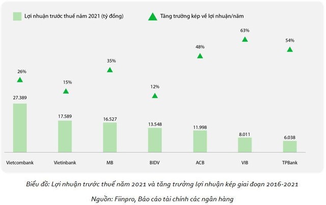 Đà tăng trưởng bền vững là điểm nổi bật của các doanh nghiệp trong danh sách Top 50 của Forbes. Trong 5 năm qua (2016 - 2021), tổng lợi nhuận trước thuế của Top 7 ngân hàng này đã tăng gấp 3 lần, từ 30 nghìn tỷ đồng lên 100 nghìn tỷ đồng. Vietcombank liên tục dẫn đầu về quy mô lợi nhuận trong nhiều năm, trong khi VIB dẫn đầu về tốc độ tăng trưởng lợi nhuận với mức tăng trưởng kép đạt 63%/năm trong 5 năm liền.