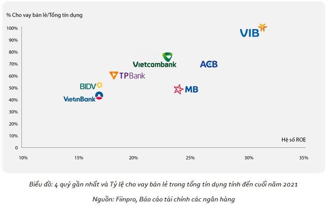 ROE (tỷ suất sinh lời trên vốn chủ sở hữu) trung bình của Top 7 nhà băng này đang ở mức 20%, cao hơn gấp đôi so với mức trung bình 8%-10% của các ngân hàng trong khu vực. Trong đó, VIB hiện dẫn đầu toàn ngành với ROE 30% cùng danh mục cho vay bán lẻ đạt gần 90%, theo sau là ACB.