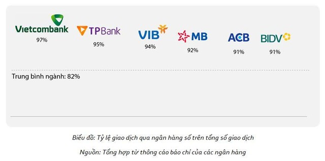 6 trong số 7 ngân hàng niêm yết tiêu biểu đã đầu tư mạnh mẽ vào công cuộc chuyển đổi số trong nhiều năm và nằm trong top dẫn đầu, với tỷ lệ giao dịch qua ngân hàng số chiếm đến trên 90% trên tổng số giao dịch.