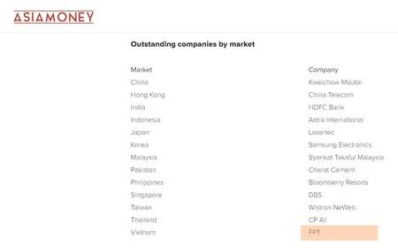 Tại thị trường Việt Nam, FPT trở thành doanh nghiệp được AsiaMoney lựa chọn với thành tựu nổi bật. Giải thưởng này đã ghi nhận những nỗ lực của FPT trong việc vượt qua những thách thức thời đại dịch, giữ vững kết quả kinh doanh tích cực, đồng thời chú trọng các công tác quản trị doanh nghiệp, quan hệ nhà đầu tư và những đóng góp cho cộng đồng, xã hội.