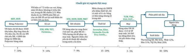 Câu chuyện của ngành dệt may thậm chí còn khó khăn hơn. Trong chuỗi giá trị của ngành dệt may, các doanh nghiệp trong ngành hiện vẫn tập trung vào khâu may gia công - là công đoạn thâm dụng lao động, không tạo ra nhiều giá trị gia tăng cho sản phẩm. Bên cạnh đó, việc sản xuất bông và polyester, đặc biệt là khâu dệt nhuộm, vẫn còn phụ thuộc vào nguồn nguyên liệu nhập khẩu. Điều này tạo sức ép lớn lên các doanh nghiệp trong chuỗi giá trị ngành dệt may nếu muốn tận dụng lợi thế từ các FTA, trong bối cảnh quy tắc xuất sứ “từ sợi trở đi” được áp dụng chặt chẽ bởi cả CPTPP, EVFTA và các đối tác nhập khẩu vải chính của Việt Nam (Trung Quốc và Đài Loan) đều không phải thành viên của 2 khối này.
