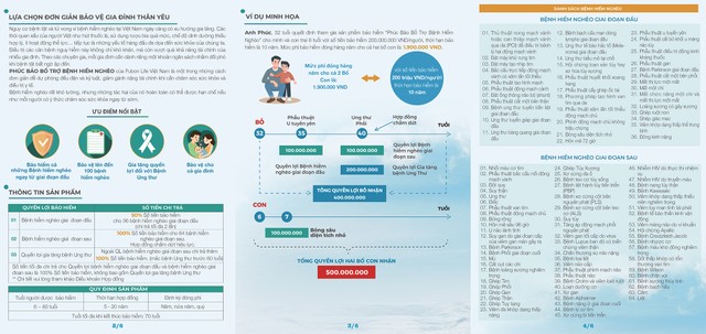 Minh họa cho sản phẩm, với trường hợp khách hàng là nam - 32 tuổi quyết định tham gia sản phẩm bảo hiểm “Phúc Bảo Bổ Trợ Bệnh Hiểm Nghèo” cho mình và con trai 6 tuổi với số tiền bảo hiểm 200.000.000 VND/người, thời hạn bảo hiểm là 10 năm. Mức phí bảo hiểm đóng hàng năm cho cả hai bố con là 1.900.000 VND. Năm khách hàng 35 tuổi, khách hàng phát hiện bị khối u tuyến yên và được bác sĩ phẫu thuật, khách hàng nhận quyền lợi bảo hiểm bệnh hiểm nghèo giai đoạn đầu là 50% số tiền bảo hiểm, tức 100.000.000 VND. Đến năm 40 tuổi khách hàng mắc ung thư phổi, khách hàng nhận quyền lợi bao gồm quyền lợi bảo hiểm bệnh hiểm nghèo giai đoạn sau và quyền lợi bảo hiểm gia tăng bệnh ung thư là 300.000.000 VND. Tổng quyền lợi bệnh hiểm nghèo khách hàng nhận được là 400.000.000 VND.