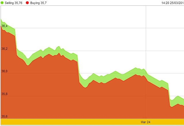 Tại thị trường trong nước, giá vàng SJC tiếp tục giảm mạnh đầu ngày hôm nay, sau đó dao động nhẹ, đến cuối ngày ở mức 35,70 - 35,76 triệu đồng/lượng, giảm 210.000 đồng/lượng so với ngày hôm qua.