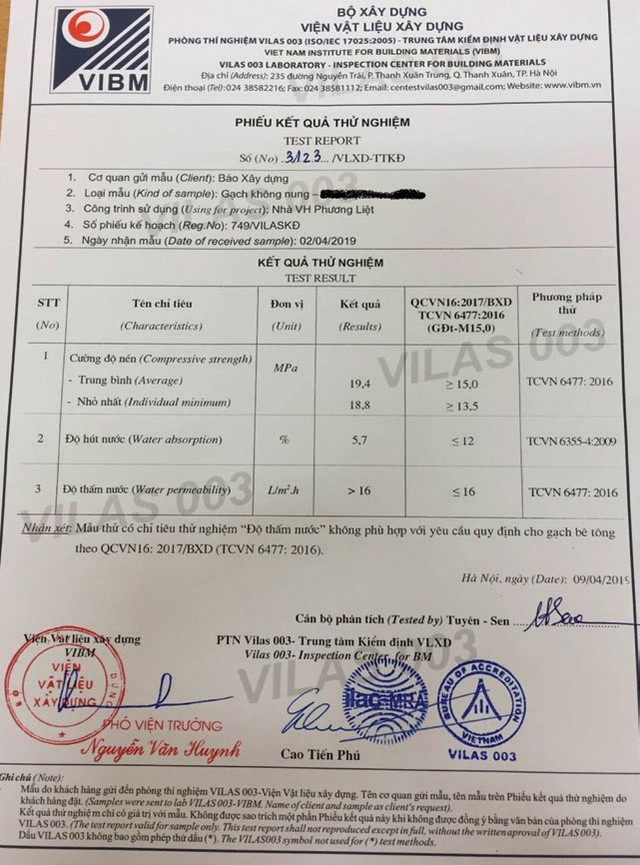 Cụ thể, kết quả kiểm nghiệm số 3123/VLXD-TTKĐ cho thấy: Đối với công trình Nhà văn hóa Phương Liệt có chỉ tiêu thử nghiệm “Độ thấm nước” không phù hợp với yêu cầu quy định cho gạch bê tông theo QCVN16: 2017/BXD (TCVN 6477: 2016).