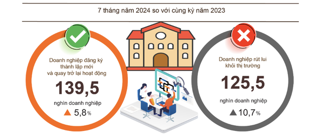 Tính chung 7 tháng năm 2024, số doanh nghiệp tạm ngừng kinh doanh có thời hạn là hơn 78.000 doanh nghiệp, tăng 16,7% so với cùng kỳ năm trước; hơn 35.500 doanh nghiệp ngừng hoạt động chờ làm thủ tục giải thể, giảm 1,5% so với cùng kỳ; và có 11.900 doanh nghiệp hoàn tất thủ tục giải thể, tăng 14,5% so với cùng kỳ.