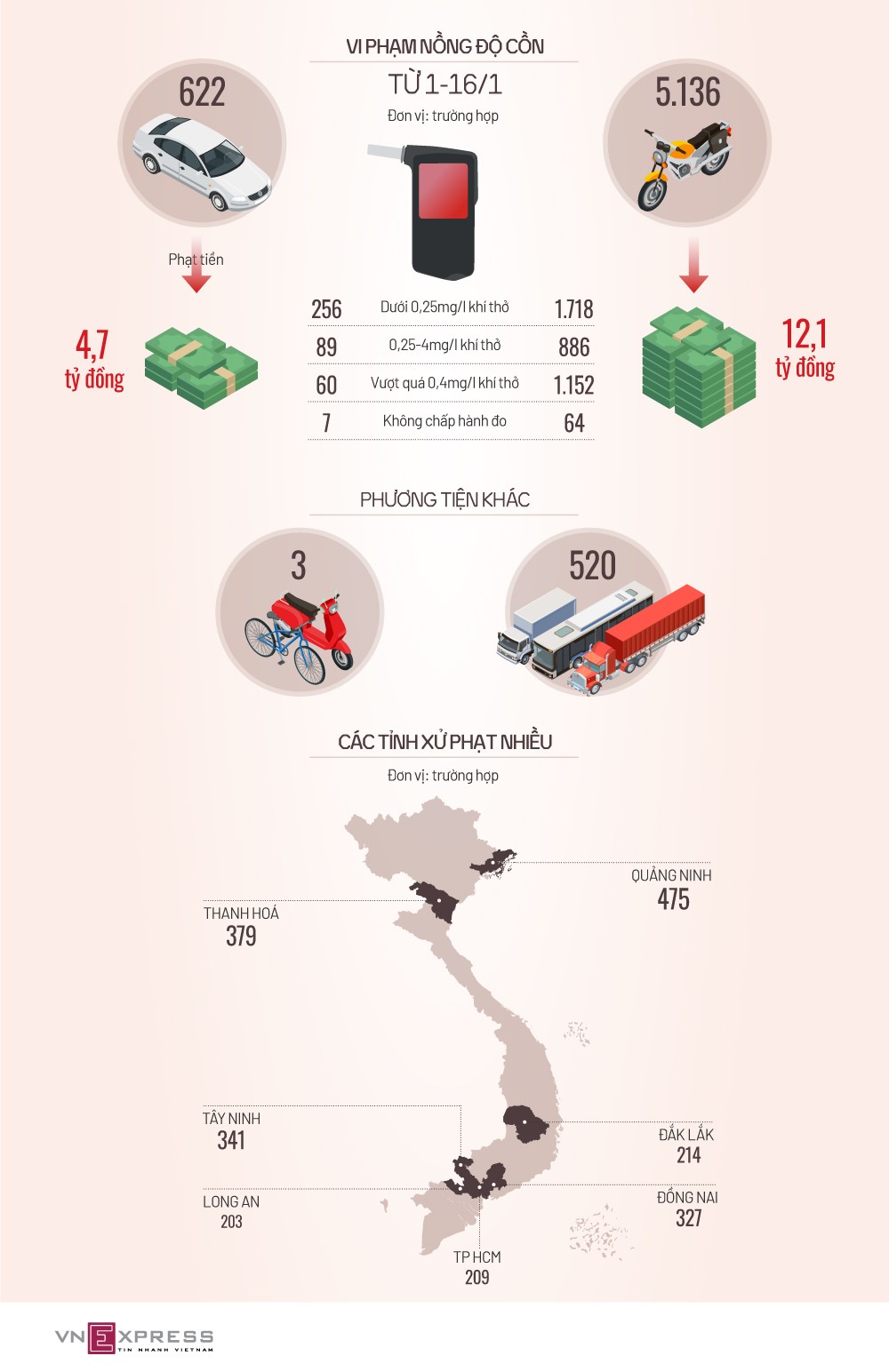 Trong nửa tháng qua, gần 6.300 tài xế bị phạt do vi phạm nồng độ cồn, trong đó xe máy chiếm hơn 5.000 trường hợp.