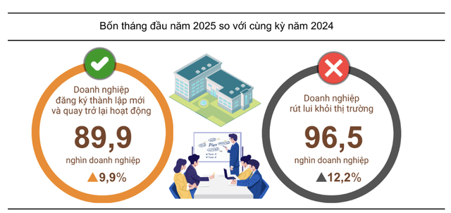 Ngoài ra, cả nước ghi nhận 38.300 doanh nghiệp quay trở lại hoạt động, tăng 29%. Tính chung, có hơn 89.900 doanh nghiệp thành lập mới và quay trở lại thị trường trong 4 tháng đầu năm, tăng 9,9% so với cùng kỳ năm 2024. Bình quân mỗi tháng có gần 22.500 doanh nghiệp gia nhập lại thị trường.