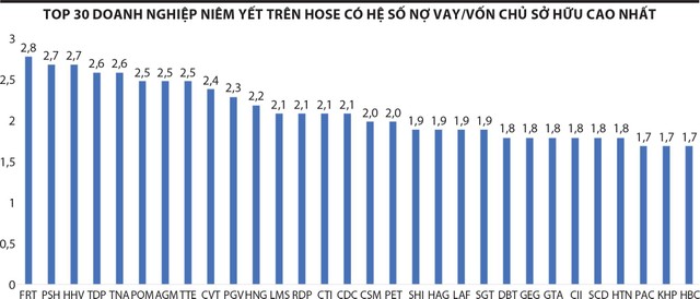 Dữ liệu của FiinPro Platform cho thấy, tính tới 30/6/2022, Top 30 doanh nghiệp có tỷ lệ nợ vay/vốn chủ sở hữu cao nhất dao động từ 1,7 - 2,8 lần. Trong đó, Công ty cổ phần Bán lẻ kỹ thuật số (FPT Retail, mã FRT) là doanh nghiệp có tỷ lệ nợ vay trên vốn chủ sở hữu cao nhất, lên tới 2,8 lần.