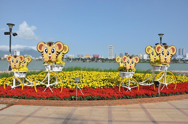 Được trang trí theo chủ đề, dọc tuyến đường Bạch Đằng và cảnh quan đôi bờ sông Hàn trở nên sống động với muôn sắc hoa tươi và những linh vật hổ ngộ nghĩnh, dễ thương.