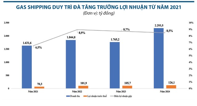 Tiếp nối đà tăng trưởng lợi nhuận liên tục từ năm 2021, Gas Shipping vẫn duy trì kết quả kinh doanh tích cực trong năm 2024 bất chấp biến động giá dầu, căng thẳng địa chính trị toàn cầu và áp lực cạnh tranh gay gắt. Nhờ tăng cường năng lực quản trị và tối ưu hiệu quả khai thác đội tàu, kết quả năm 2024, doanh nghiệp ghi nhận doanh thu 2.293,5 tỷ đồng, lợi nhuận trước thuế 126,1 tỷ đồng, tăng lần lượt 27% và 19% so với cùng kỳ.