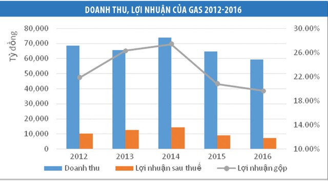 Theo báo cáo tài chính năm 2016, doanh thu thuần của GAS đạt 59.209 tỷ đồng, lợi nhuận sau thuế 7.237 tỷ đồng, giảm lần lượt 8% so và 20% so với năm 2015.