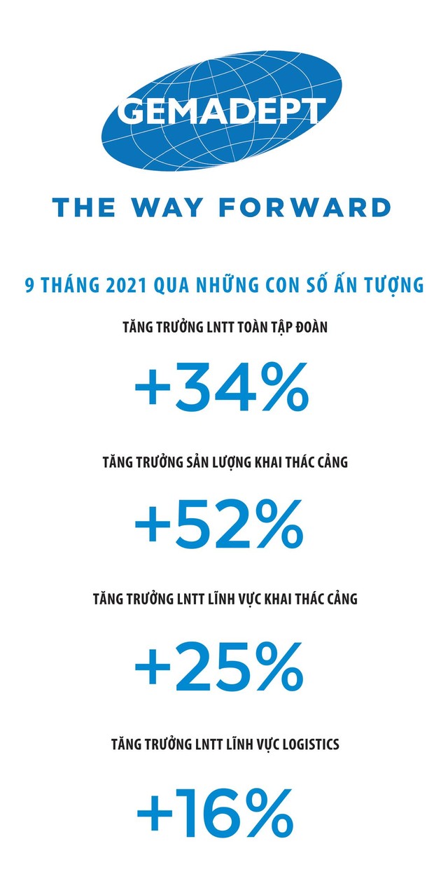 Kết thúc 9 tháng đầu năm 2021, tổng sản lượng hàng hóa thông qua hệ thống Cảng của Gemadept trên cả 3 miền tăng mạnh 52% so với cùng kỳ năm 2020. Đặc biệt, với sự ra đời và đi vào hoạt động đúng thời điểm của siêu cảng nước sâu Gemalink ngay từ đầu năm 2021, khối cảng miền Nam của Gemadept đã có tốc độ tăng trưởng ấn tượng, tăng gần gấp 2 lần so với cùng kỳ.