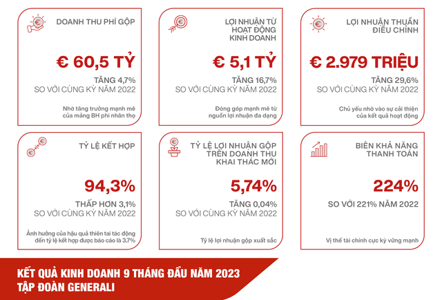 Phó tổng giám đốc Tài chính Tập đoàn Generali, ông Cristiano Borean, nhận định: “Tập đoàn Generali tiếp tục duy trì tăng trưởng lợi nhuận trong 9 tháng đầu năm 2023 nhờ sự phát triển mạnh mẽ của cả kết quả hoạt động và lợi nhuận ròng mặc dù chịu tác động lớn từ thiên tai, chứng minh khả năng hồi phục của Tập đoàn trong bối cảnh kinh tế vĩ mô và địa chính trị đầy thách thức.
