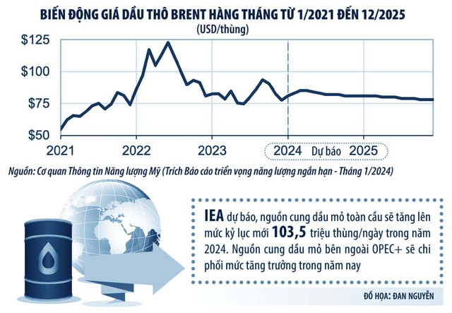 Trong kịch bản giá biến động tương đối ít nhờ triển vọng cung và cầu toàn cầu sẽ tương đối cân bằng, Cơ quan Thông tin năng lượng Mỹ dự đoán giá dầu thô Brent sẽ đạt trung bình 82 USD/thùng trong năm 2024 và 79 USD/thùng vào năm 2025, sát với mức trung bình năm 2023 là 82 USD/thùng.