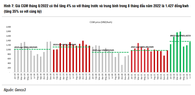 Với việc giá than đầu vào cho nhiệt điện than tăng lên và nhu cầu điện trên toàn quốc tiếp tục phục hồi, giá CGM có thể duy trì mức giá của tháng 8/2022 trong 4 tháng tới và giá CGM trung bình cả năm 2022 có thể đạt 1.400 đồng/kwh (tăng 41% so với cùng kỳ). Do đó, SSI điều chỉnh tăng 5% cho dự báo giá CGM năm 2022, lên mức 1.370 đồng/kwh.