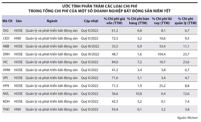 Ghi nhận tại báo cáo tài chính nhiều doanh nghiệp như Nam Long, Đất Xanh, Vinhomes, Hải Phát Invest, Văn Phú Invest, TTC Land, Khang Điền, Long Điền, Năm Bảy Bảy… cho thấy, các loại chi phí như chi phí giá vốn, quản lý doanh nghiệp, bán hàng… chiếm tới 70-75% tổng chi phí (xem bảng), cộng với chi phí tài chính rơi vào khoảng từ 10-15%, buộc các chủ đầu tư phải điều chỉnh giá bán theo hướng tăng để đảm bảo lợi nhuận.