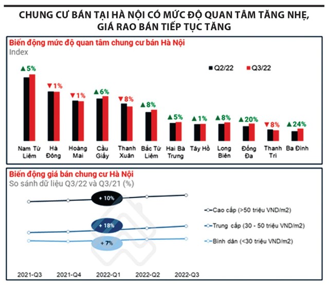 Số liệu thống kê mới nhất của Batdongsan.com.vn cho thấy, trong quý III/2022, giá bán chung cư tăng ở tất cả các phân khúc, từ bình dân đến cao cấp, trong đó chung cư trung cấp tăng giá mạnh nhất. Cụ thể, tại Hà Nội, giá bán chung cư bình dân tăng 7%; trung cấp tăng 18% và cao cấp tăng 10%. Còn tại TP.HCM, giá nhà chung cư có mức tăng thấp hơn, với phân khúc trung cấp tăng 4%; cao cấp tăng 5%, trong khi bình dân giảm 1%.