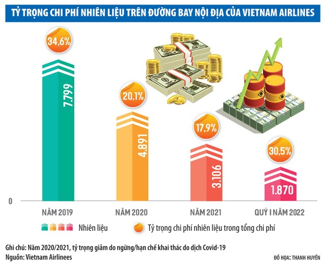 Theo ông Lê Hồng Hà, Tổng giám đốc Vietnam Airlines, việc giá nhiên liệu Jet A1 trung bình tháng 3/2021 đạt trên 130 USD/thùng đang khiến chi phí nhiên liệu của Tổng công ty tăng mạnh. Nếu giá nhiên liệu bay duy trì ở mức 130 USD/thùng cho cả năm 2022, thì chi phí ước tính của Vietnam Airlines sẽ tăng thêm khoảng 5.700 tỷ đồng. Còn nếu giá dầu Jet A1 tăng lên khoảng 160 USD/thùng, thì chi phí tăng thêm của Vietnam Airlines sẽ ở mức 9.100 tỷ đồng.