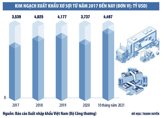 Trong đà tăng cao của nhu cầu sợi từ các thị trường lớn như Trung Quốc, Hàn Quốc, căn cứ năng lực cung ứng của các doanh nghiệp Việt Nam và các đơn hàng đã ký, xuất khẩu xơ sợi trong năm 2021 dự báo đạt 5,2 - 5,3 tỷ USD.