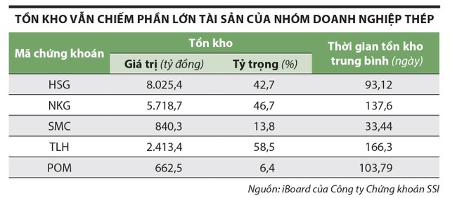 Ngoại trừ Đầu tư Thương mại SMC và Thép Pomina gặp khó khăn về tài chính, nợ vay lớn, kinh doanh thua lỗ, lượng tồn kho thép thấp do đang trong quá trình tái cơ cấu, bán bớt tài sản và thu hẹp kinh doanh để ổn định dòng tiền, thì nhiều doanh nghiệp thép có tỷ trọng tồn kho tương đối lớn.