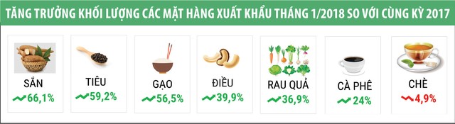 Theo thông tin từ Bộ Nông nghiệp và Phát triển nông thôn, xuất khẩu gạo là điểm sáng nổi bật nhất trong bức tranh xuất khẩu của tháng đầu tiên năm 2018. Cụ thể, toàn ngành đã xuất đi 524 ngàn tấn gạo, đem về 249 triệu USD, tăng 56,5% về lượng và 74,2% về giá trị so với cùng kỳ năm ngoái.