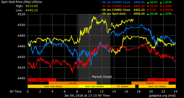 Trên thị trường vàng thế giới, giá vàng giao ngay chốt phiên hôm qua tại Mỹ tăng 32,1 USD, tương ứng tăng 0,72% lên mức 4.509,7 USD/ounce.
